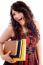female, lady, woman, girl, people, person, young, adult, caucasian, white, brunette, hair, haired, brown, brunet, curly, smiling, smiley, smile, grin, grinning, happy, cheerful, emotion, reaction, facial, expression, face, hands, hold, holding, books, notebook, hardcover, hardback, object, student, scholar, college, university, tertiary, education, high, school, further, continuing, higher, undergraduate, postgraduate, isolated, background, gesture, gesturing, vertical, ok, sign, symbol, approve, approval, positive, show, showing, stand, standing, stood, carry, carrying