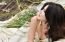 woman, female, lady, girl, people, person, young, adult, caucasian, white, brunette, hair, haired, brown, brunet, curly, long, stand, standing, stood, hand, hold, holding, flower, cut, bloom, rose, green, window, looking, sideways, aside, sidewards, left, right, back, view, behind, reverse, vertical