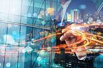 Download “Double Exposure Of Businessman Draw Something With City Traffic Scene At Night And Glass Decorated Building” by thampapon1