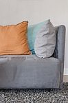 Download “Orange Color Pillow On Grey Sofa In Living Room” by khongkitwiriyachan