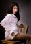 Sexy girl wearing a white shirt and sitting on a wooden chair.