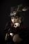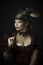 Emotional Portrait of Young Woman in Steampunk or Retro style. Studio shot. Model on a Black Background.