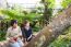 Ornate Buddhist temple complex featuring stone lions & a gilded chedi amid tropical greenery.